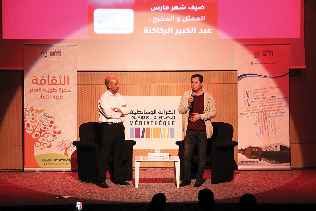 Pour ceux qui préfèrent le cinéma ou le théâtre, il y a aussi de quoi faire. Au cinéclub, les projections se suivent, puis les films sont débattus. De grands noms du cinéma marocain y sont conviés tout au long de l’année. En août 2017, les adhérents ont eu le droit à une rare projection des courtsmétrages de Nour-Eddine Lakhmari produits dans les par le personnel de la médiaannées 1990... et en présence du réalisateur. Celui qui a depuis réalisé Casanegra et BurnOut a partagé son expérience, sa vision du cinéma avec le public khouribgi.